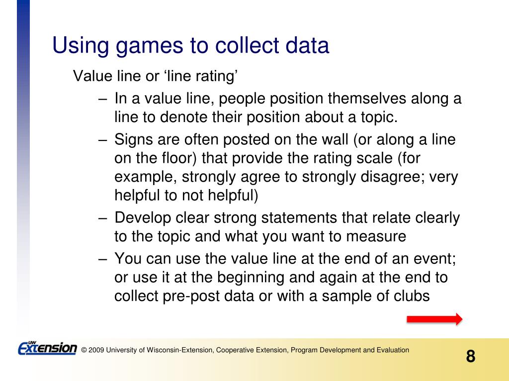 Using games to collect data Value line or ‘line rating’ • In a value line, people position themselves along a line to denote their position about a topic. • Signs are often posted on the wall (or along a line on the floor) that provide the rating scale (for example, strongly agree to strongly disagree; very helpful to not helpful) • Develop clear strong statements that relate clearly to the topic and what you want to measure • You can use the value line at the end of an event; or use it at the beginning and again at the end to collect pre-post data or with a sample of clubs