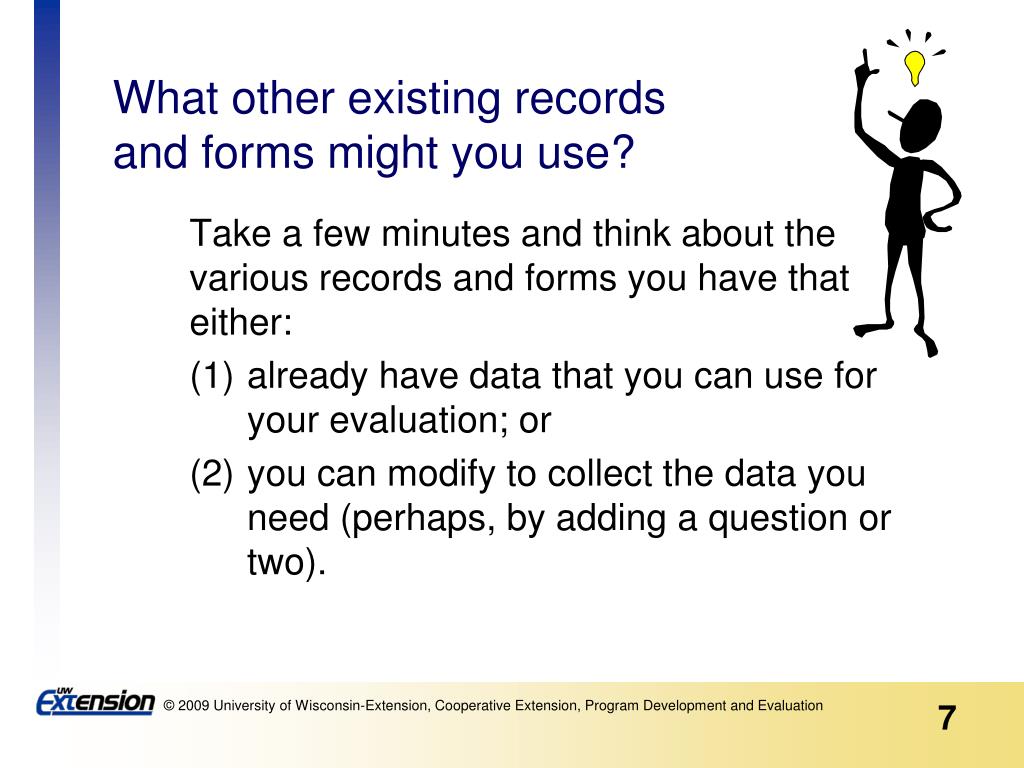 What other existing records and forms might you use? Take a few minutes and think about the various records and forms you have that either: • already have data that you can use for your evaluation; or • you can modify to collect the data you need (perhaps, by adding a question or two).