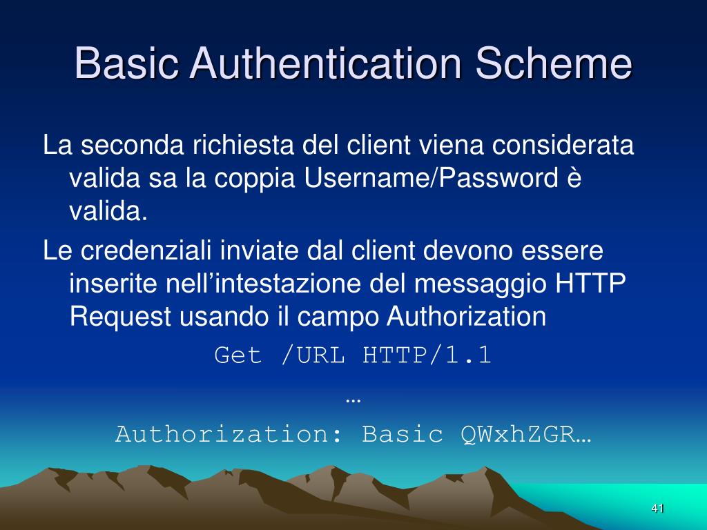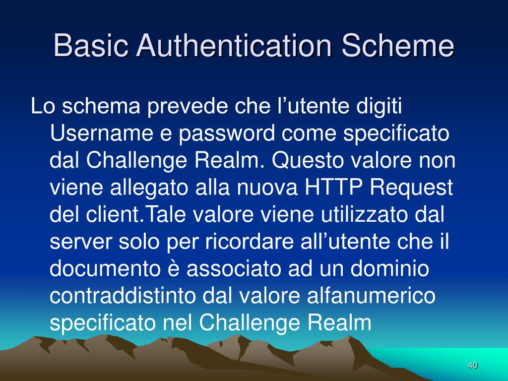 Basic Authentication Scheme Lo schema prevede che l’utente digiti Username e password come specificato dal Challenge Realm. Questo valore non viene allegato alla nuova HTTP Request del client.Tale valore viene utilizzato dal server solo per ricordare all’utente che il documento è associato ad un dominio contraddistinto dal valore alfanumerico specificato nel Challenge Realm