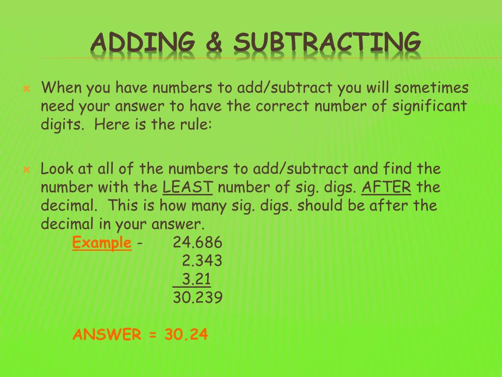 When you have numbers to add/subtract you will sometimes need your answer to have the correct number of significant digits. Here is the rule: Look at all of the numbers to add/subtract and find the number with the LEAST number of sig. digs. AFTER the decimal. This is how many sig. digs. should be after the decimal in your answer. Example - 24.686 2.343 3.21 30.239 ANSWER = 30.24 ADDING & SUBTRACTING