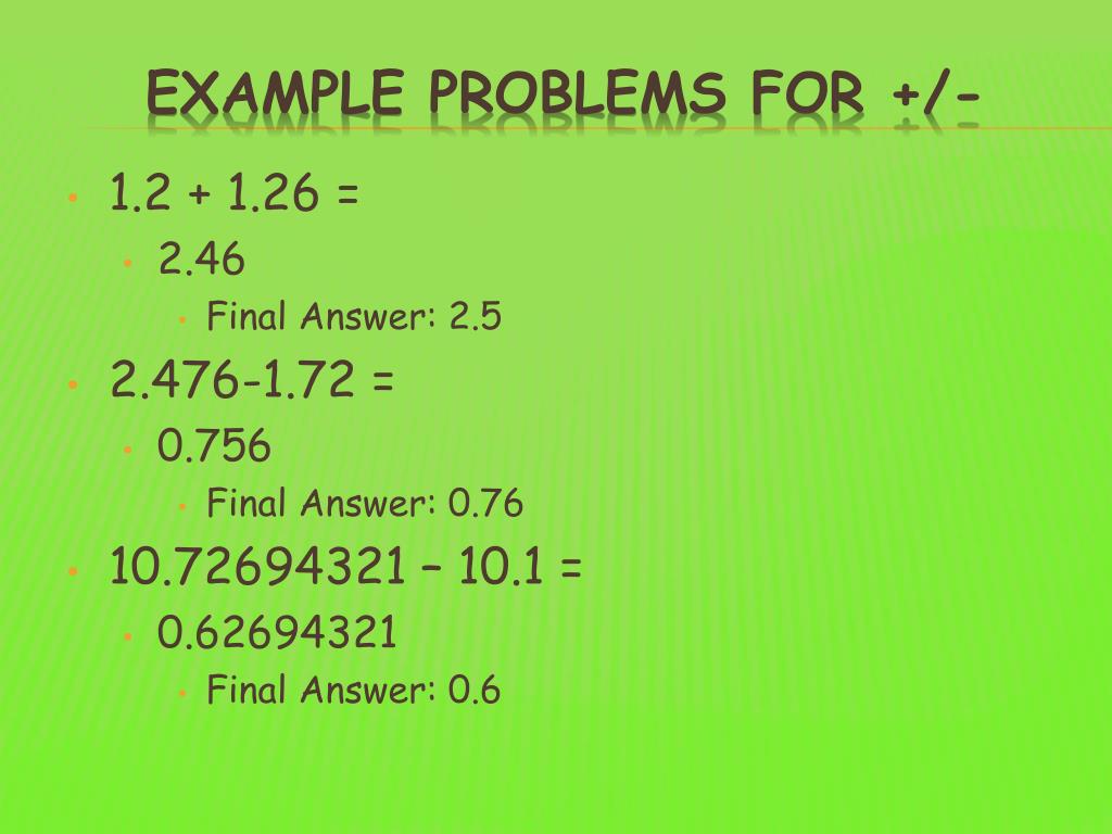 1.2 + 1.26 = • 2.46 • Final Answer: 2.5 • 2.476-1.72 = • 0.756 • Final Answer: 0.76 • 10.72694321 – 10.1 = • 0.62694321 • Final Answer: 0.6 EXAMPLE PROBLEMS FOR +/-