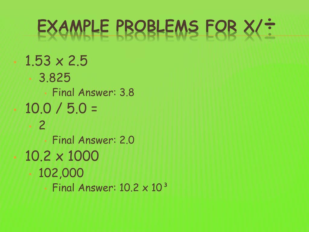 1.53 x 2.5 • 3.825 • Final Answer: 3.8 • 10.0 / 5.0 = • 2 • Final Answer: 2.0 • 10.2 x 1000 • 102,000 • Final Answer: 10.2 x 10³ EXAMPLE PROBLEMS FOR X/÷