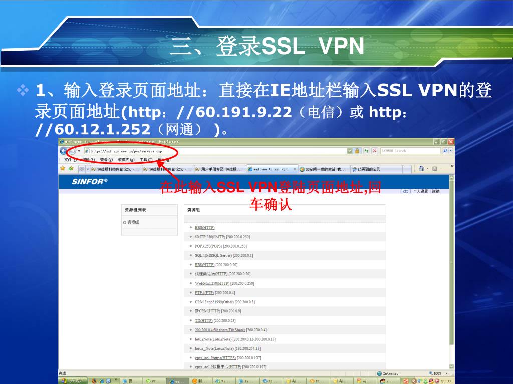 三、登录SSL VPN • 1、输入登录页面地址:直接在IE地址栏输入SSL VPN的登录页面地址(http://60.191.9.22(电信)或 http://60.12.1.252(网通) )。 在此输入SSL VPN登陆页面地址,回车确认