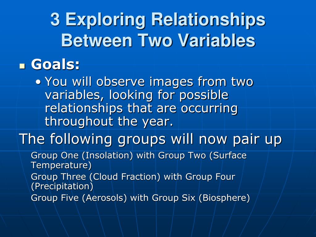 3 Exploring Relationships Between Two Variables • Goals: • You will observe images from two variables, looking for possible relationships that are occurring throughout the year. The following groups will now pair up Group One (Insolation) with Group Two (Surface Temperature) Group Three (Cloud Fraction) with Group Four (Precipitation) Group Five (Aerosols) with Group Six (Biosphere)
