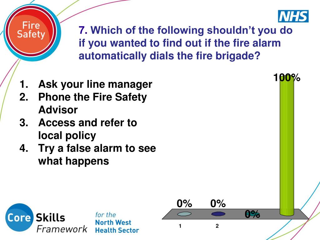 7. Which of the following shouldn’t you do if you wanted to find out if the fire alarm automatically dials the fire brigade? • Ask your line manager • Phone the Fire Safety Advisor • Access and refer to local policy • Try a false alarm to see what happens