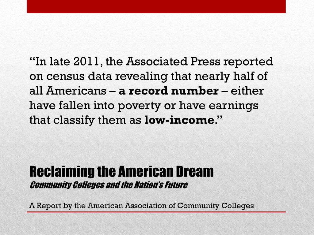 “In late 2011, the Associated Press reported on census data revealing that nearly half of all Americans – a record number – either have fallen into poverty or have earnings that classify them as low-income.” Reclaiming the American DreamCommunity Colleges and the Nation’s FutureA Report by the American Association of Community Colleges
