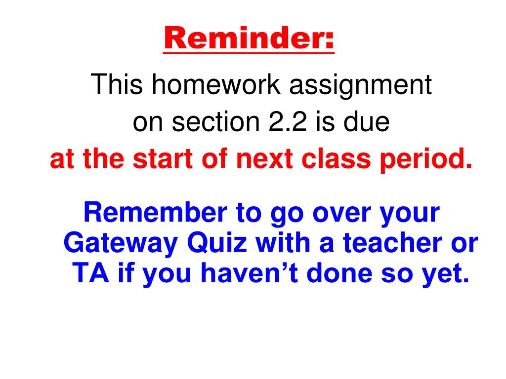 Reminder: This homework assignment on section 2.2 is due at the start of next class period. Remember to go over your Gateway Quiz with a teacher or TA if you haven’t done so yet.
