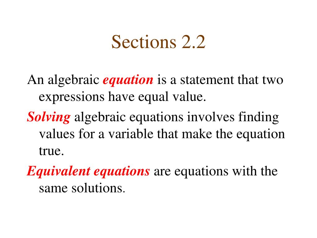 Sections 2.2 An algebraic equationis a statement that two expressions have equal value. Solving algebraic equations involves finding values for a variable that make the equation true. Equivalent equations are equations with the same solutions.
