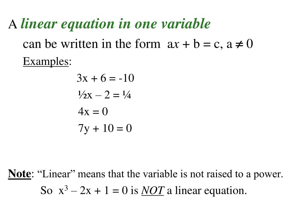 Alinear equation in one variable can be written in the form ax + b = c, a 0 Examples: 3x + 6 = -10 ½x – 2 = ¼ 4x = 0 7y + 10 = 0 Note: “Linear” means that the variable is not raised to a power. So x3 – 2x + 1 = 0 is NOT a linear equation.