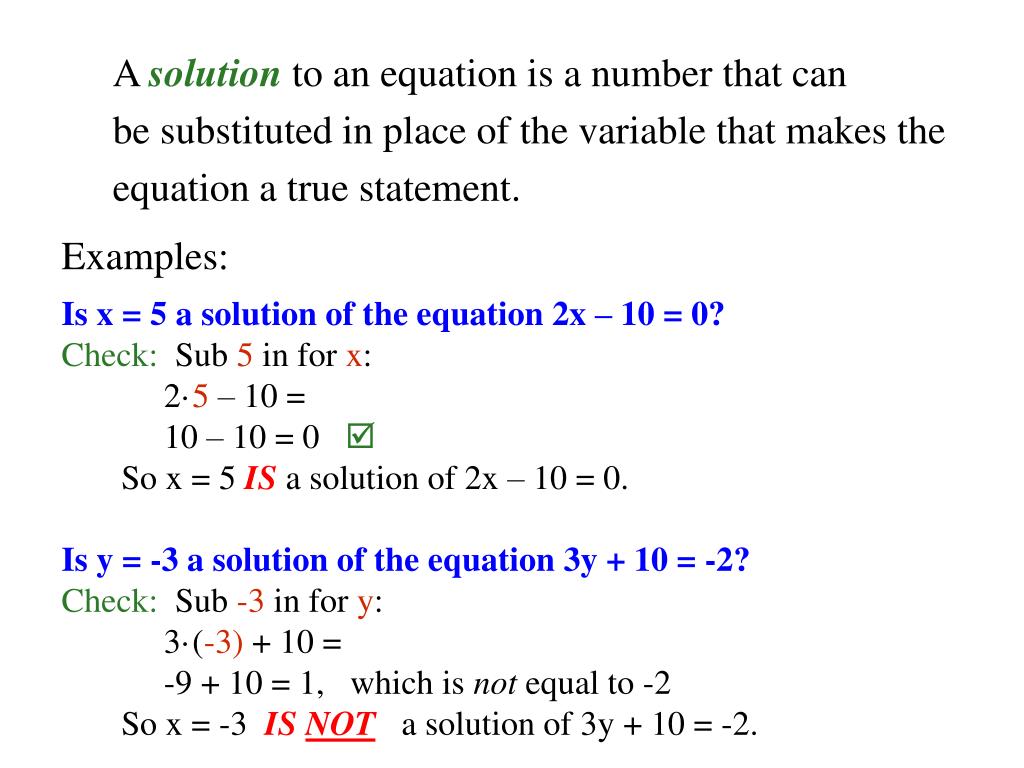 A solution to an equation is a number that can be substituted in place of the variable that makes the equation a true statement. • Examples: • Is x = 5 a solution of the equation 2x – 10 = 0? • Check: Sub 5 in for x: • 2·5 – 10 = • 10 – 10 = 0 • So x = 5 IS a solution of 2x – 10 = 0. • Is y = -3 a solution of the equation 3y + 10 = -2? • Check: Sub -3 in for y: • 3·(-3) + 10 = • -9 + 10 = 1, which is not equal to -2 • So x = -3 ISNOTa solution of 3y + 10 = -2.