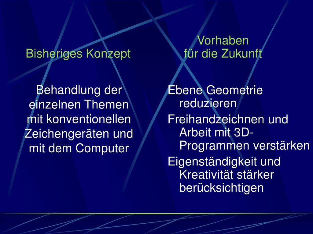 Bisheriges KonzeptBehandlung der einzelnen Themen mit konventionellen Zeichengeräten und mit dem Computer Ebene Geometrie reduzieren Freihandzeichnen und Arbeit mit 3D-Programmen verstärken Eigenständigkeit und Kreativität stärker berücksichtigen Vorhaben für die Zukunft