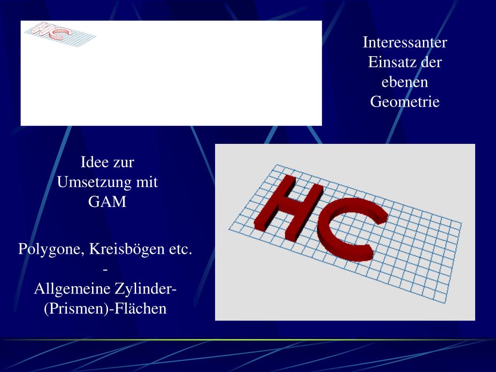Interessanter Einsatz der ebenen Geometrie Idee zur Umsetzung mit GAM Polygone, Kreisbögen etc. -Allgemeine Zylinder- (Prismen)-Flächen