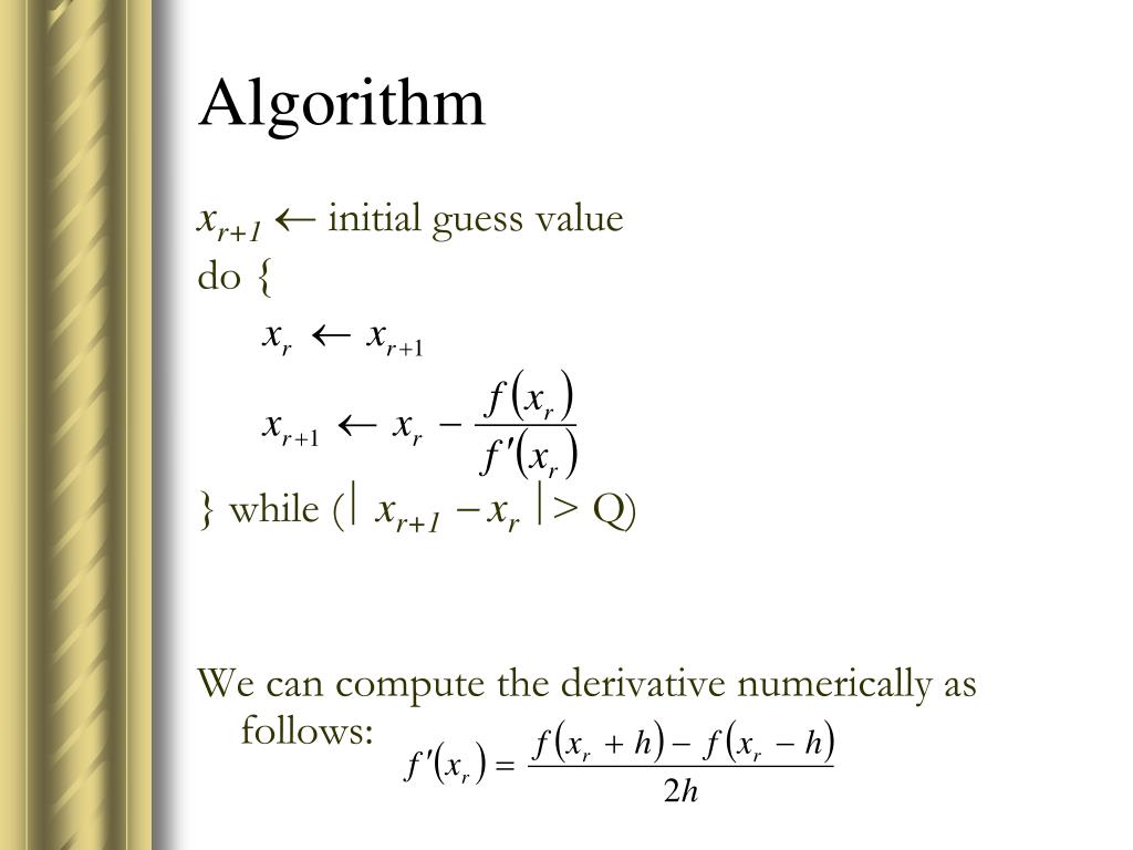 Algorithm xr+1initial guess value do { } while ( xr+1 xr> Q) We can compute the derivative numerically as follows: