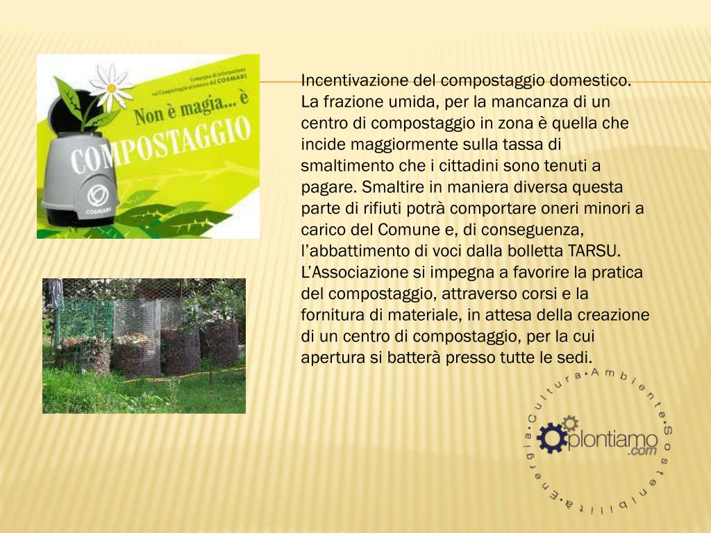 Incentivazione del compostaggio domestico. La frazione umida, per la mancanza di un centro di compostaggio in zona è quella che incide maggiormente sulla tassa di smaltimento che i cittadini sono tenuti a pagare. Smaltire in maniera diversa questa parte di rifiuti potrà comportare oneri minori a carico del Comune e, di conseguenza, l’abbattimento di voci dalla bolletta TARSU. L’Associazione si impegna a favorire la pratica del compostaggio, attraverso corsi e la fornitura di materiale, in attesa della creazione di un centro di compostaggio, per la cui apertura si batterà presso tutte le sedi.
