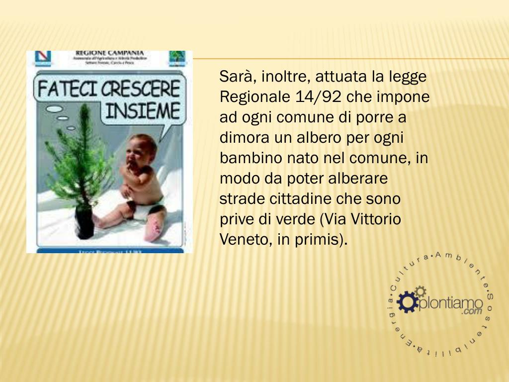 Sarà, inoltre, attuata la legge Regionale 14/92 che impone ad ogni comune di porre a dimora un albero per ogni bambino nato nel comune, in modo da poter alberare strade cittadine che sono prive di verde (Via Vittorio Veneto, in primis).