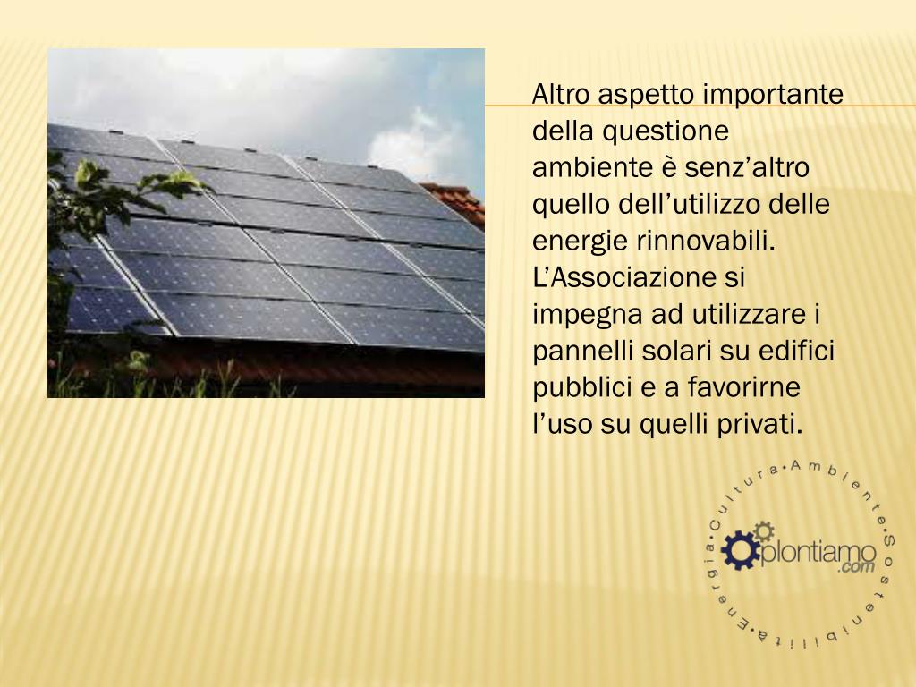 Altro aspetto importante della questione ambiente è senz’altro quello dell’utilizzo delle energie rinnovabili. L’Associazione si impegna ad utilizzare i pannelli solari su edifici pubblici e a favorirne l’uso su quelli privati.