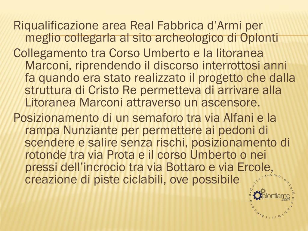 Riqualificazione area Real Fabbrica d’Armi per meglio collegarla al sito archeologico di Oplonti Collegamento tra Corso Umberto e la litoranea Marconi, riprendendo il discorso interrottosi anni fa quando era stato realizzato il progetto che dalla struttura di Cristo Re permetteva di arrivare alla Litoranea Marconi attraverso un ascensore. Posizionamento di un semaforo tra via Alfani e la rampa Nunziante per permettere ai pedoni di scendere e salire senza rischi, posizionamento di rotonde tra via Prota e il corso Umberto o nei pressi dell’incrocio tra via Bottaro e via Ercole, creazione di piste ciclabili, ove possibile