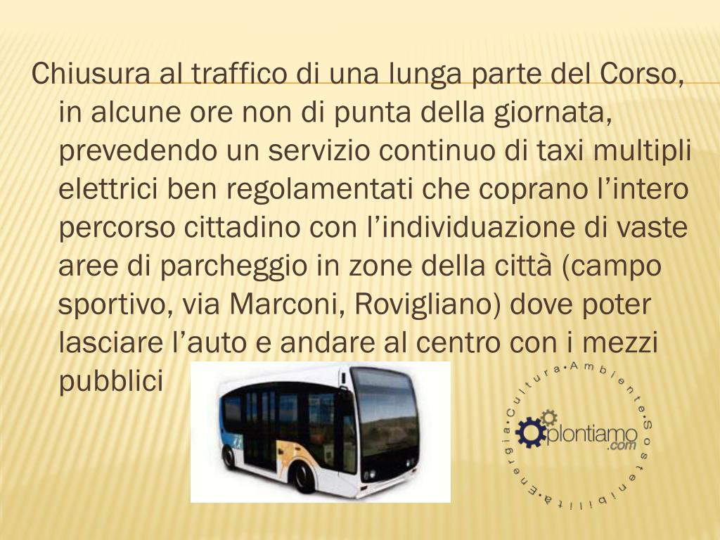 Chiusura al traffico di una lunga parte del Corso, in alcune ore non di punta della giornata, prevedendo un servizio continuo di taxi multipli elettrici ben regolamentati che coprano l’intero percorso cittadino con l’individuazione di vaste aree di parcheggio in zone della città (campo sportivo, via Marconi, Rovigliano) dove poter lasciare l’auto e andare al centro con i mezzi pubblici