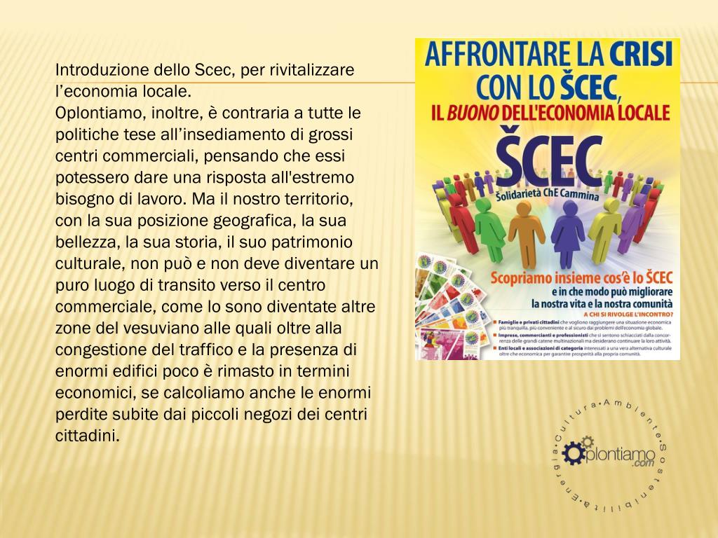 Introduzione dello Scec, per rivitalizzare l’economia locale. Oplontiamo, inoltre, è contraria a tutte le politiche tese all’insediamento di grossi centri commerciali, pensando che essi potessero dare una risposta all'estremo bisogno di lavoro. Ma il nostro territorio, con la sua posizione geografica, la sua bellezza, la sua storia, il suo patrimonio culturale, non può e non deve diventare un puro luogo di transito verso il centro commerciale, come lo sono diventate altre zone del vesuviano alle quali oltre alla congestione del traffico e la presenza di enormi edifici poco è rimasto in termini economici, se calcoliamo anche le enormi perdite subite dai piccoli negozi dei centri cittadini.