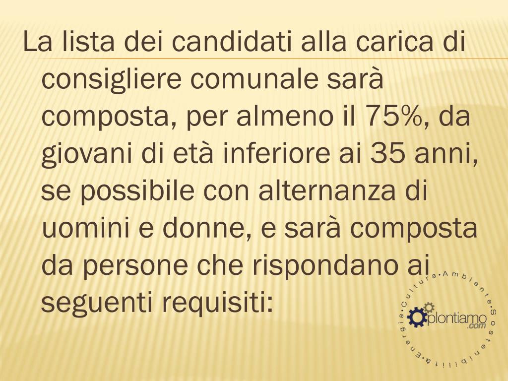 La lista dei candidati alla carica di consigliere comunale sarà composta, per almeno il 75%, da giovani di età inferiore ai 35 anni, se possibile con alternanza di uomini e donne, e sarà composta da persone che rispondano ai seguenti requisiti: