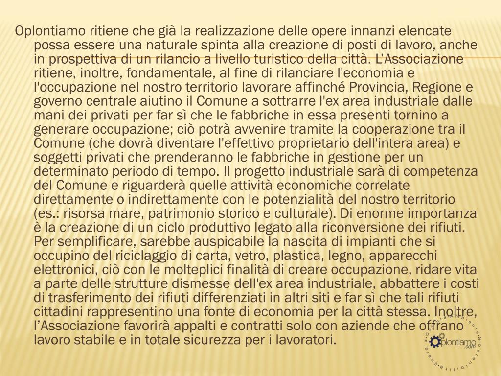 Oplontiamo ritiene che già la realizzazione delle opere innanzi elencate possa essere una naturale spinta alla creazione di posti di lavoro, anche in prospettiva di un rilancio a livello turistico della città. L’Associazione ritiene, inoltre, fondamentale, al fine di rilanciare l'economia e l'occupazione nel nostro territorio lavorare affinché Provincia, Regione e governo centrale aiutino il Comune a sottrarre l'ex area industriale dalle mani dei privati per far sì che le fabbriche in essa presenti tornino a generare occupazione; ciò potrà avvenire tramite la cooperazione tra il Comune (che dovrà diventare l'effettivo proprietario dell'intera area) e soggetti privati che prenderanno le fabbriche in gestione per un determinato periodo di tempo. Il progetto industriale sarà di competenza del Comune e riguarderà quelle attività economiche correlate direttamente o indirettamente con le potenzialità del nostro territorio (es.: risorsa mare, patrimonio storico e culturale). Di enorme importanza è la creazione di un ciclo produttivo legato alla riconversione dei rifiuti. Per semplificare, sarebbe auspicabile la nascita di impianti che si occupino del riciclaggio di carta, vetro, plastica, legno, apparecchi elettronici, ciò con le molteplici finalità di creare occupazione, ridare vita a parte delle strutture dismesse dell'ex area industriale, abbattere i costi di trasferimento dei rifiuti differenziati in altri siti e far sì che tali rifiuti cittadini rappresentino una fonte di economia per la città stessa. Inoltre, l’Associazione favorirà appalti e contratti solo con aziende che offrano lavoro stabile e in totale sicurezza per i lavoratori.