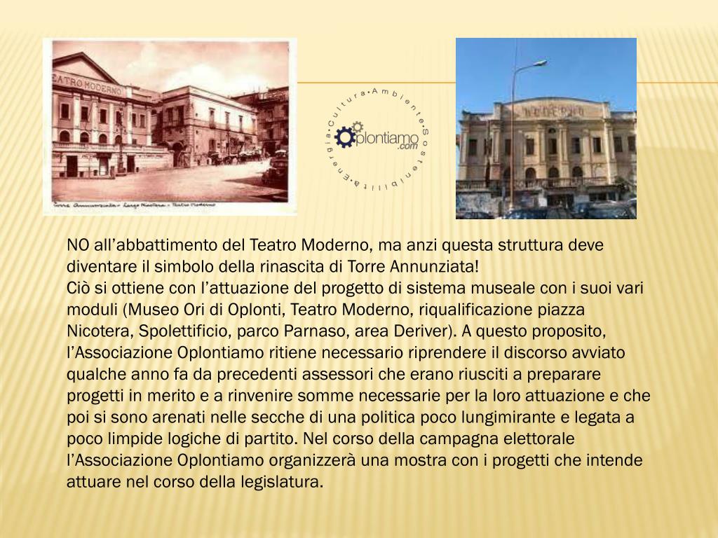NO all’abbattimento del Teatro Moderno, ma anzi questa struttura deve diventare il simbolo della rinascita di Torre Annunziata! Ciò si ottiene con l’attuazione del progetto di sistema museale con i suoi vari moduli (Museo Ori di Oplonti, Teatro Moderno, riqualificazione piazza Nicotera, Spolettificio, parco Parnaso, area Deriver). A questo proposito, l’Associazione Oplontiamo ritiene necessario riprendere il discorso avviato qualche anno fa da precedenti assessori che erano riusciti a preparare progetti in merito e a rinvenire somme necessarie per la loro attuazione e che poi si sono arenati nelle secche di una politica poco lungimirante e legata a poco limpide logiche di partito. Nel corso della campagna elettorale l’Associazione Oplontiamo organizzerà una mostra con i progetti che intende attuare nel corso della legislatura.