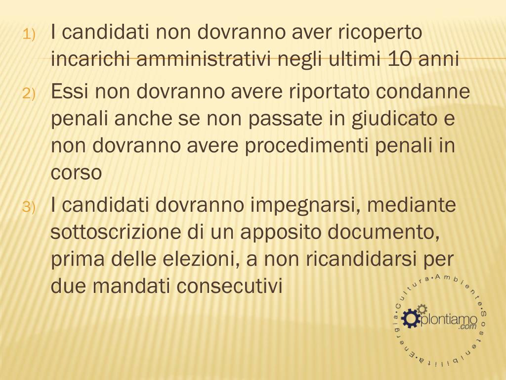 I candidati non dovranno aver ricoperto incarichi amministrativi negli ultimi 10 anni Essi non dovranno avere riportato condanne penali anche se non passate in giudicato e non dovranno avere procedimenti penali in corso I candidati dovranno impegnarsi, mediante sottoscrizione di un apposito documento, prima delle elezioni, a non ricandidarsi per due mandati consecutivi