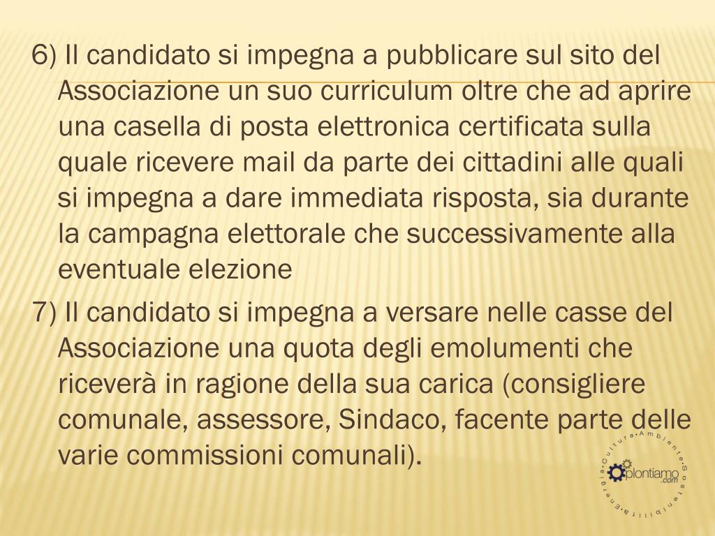 6) Il candidato si impegna a pubblicare sul sito del Associazione un suo curriculum oltre che ad aprire una casella di posta elettronica certificata sulla quale ricevere mail da parte dei cittadini alle quali si impegna a dare immediata risposta, sia durante la campagna elettorale che successivamente alla eventuale elezione 7) Il candidato si impegna a versare nelle casse del Associazione una quota degli emolumenti che riceverà in ragione della sua carica (consigliere comunale, assessore, Sindaco, facente parte delle varie commissioni comunali).