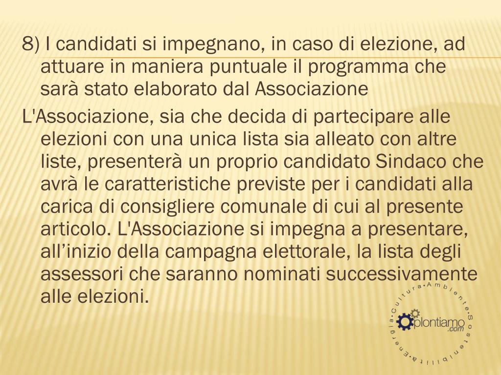 8) I candidati si impegnano, in caso di elezione, ad attuare in maniera puntuale il programma che sarà stato elaborato dal Associazione L'Associazione, sia che decida di partecipare alle elezioni con una unica lista sia alleato con altre liste, presenterà un proprio candidato Sindaco che avrà le caratteristiche previste per i candidati alla carica di consigliere comunale di cui al presente articolo. L'Associazione si impegna a presentare, all’inizio della campagna elettorale, la lista degli assessori che saranno nominati successivamente alle elezioni.