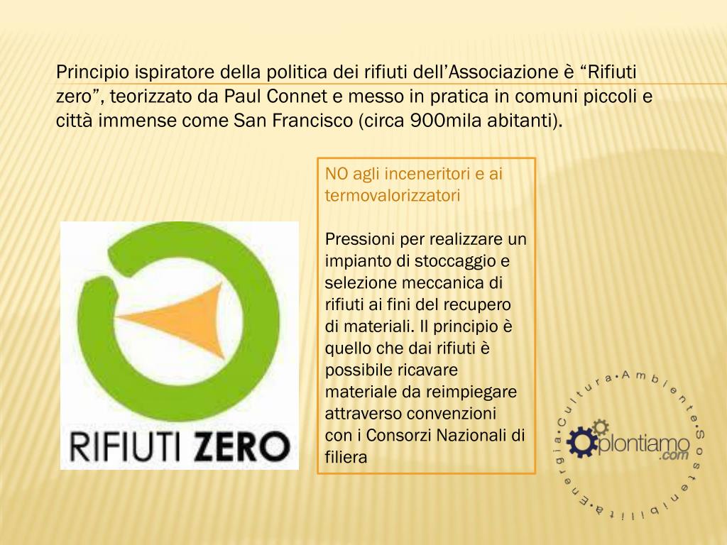 Principio ispiratore della politica dei rifiuti dell’Associazione è “Rifiuti zero”, teorizzato da Paul Connet e messo in pratica in comuni piccoli e città immense come San Francisco (circa 900mila abitanti). NO agli inceneritori e ai termovalorizzatori Pressioni per realizzare un impianto di stoccaggio e selezione meccanica di rifiuti ai fini del recupero di materiali. Il principio è quello che dai rifiuti è possibile ricavare materiale da reimpiegare attraverso convenzioni con i Consorzi Nazionali di filiera