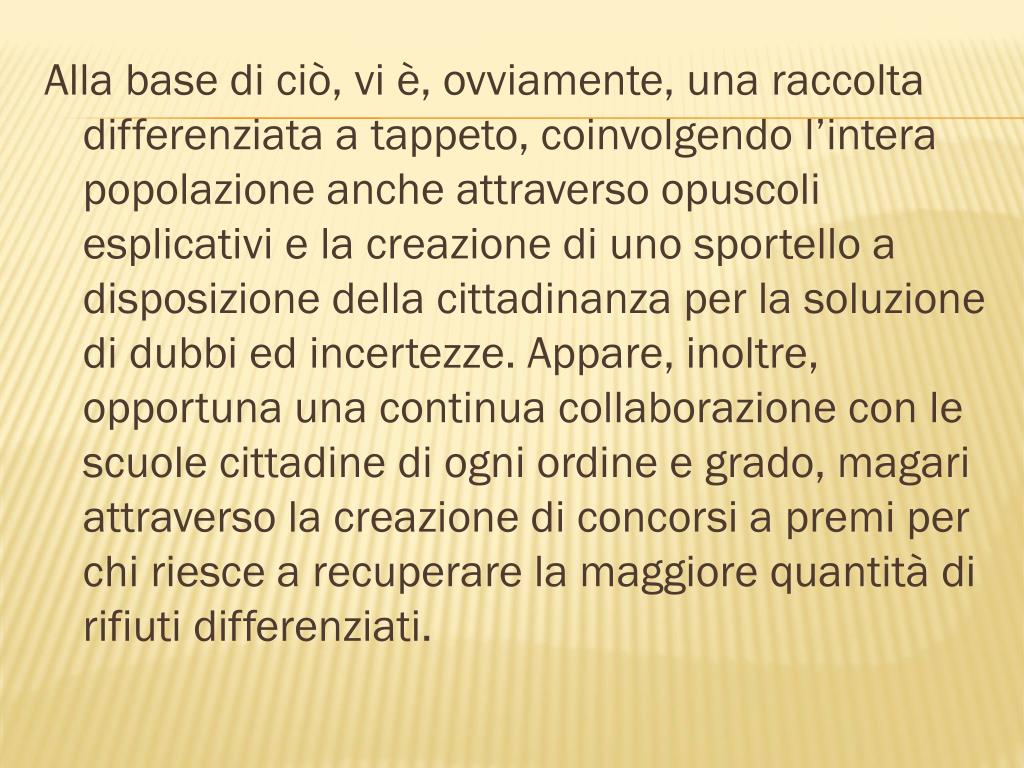 Alla base di ciò, vi è, ovviamente, una raccolta differenziata a tappeto, coinvolgendo l’intera popolazione anche attraverso opuscoli esplicativi e la creazione di uno sportello a disposizione della cittadinanza per la soluzione di dubbi ed incertezze. Appare, inoltre, opportuna una continua collaborazione con le scuole cittadine di ogni ordine e grado, magari attraverso la creazione di concorsi a premi per chi riesce a recuperare la maggiore quantità di rifiuti differenziati.