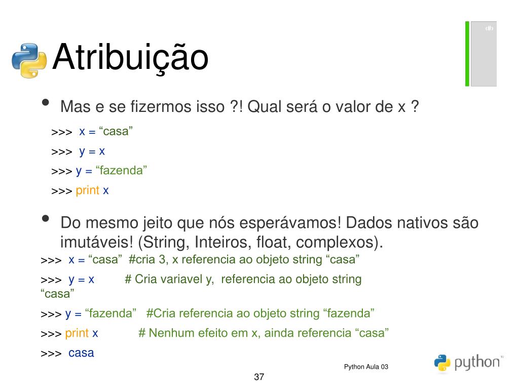 Atribuição • Atribuição de uma variável em Python significa criar um rótulo para armazenar uma referência para algum objeto. • Atribuição cria referências e não cópias! • Inferência do tipo da referência baseado no tipo de dado atribuído • A referência é deletada por meio de Garbage Collection • Quando o objeto deixa de ser referenciado por nenhum outro rótulo(variável). Python Aula 03