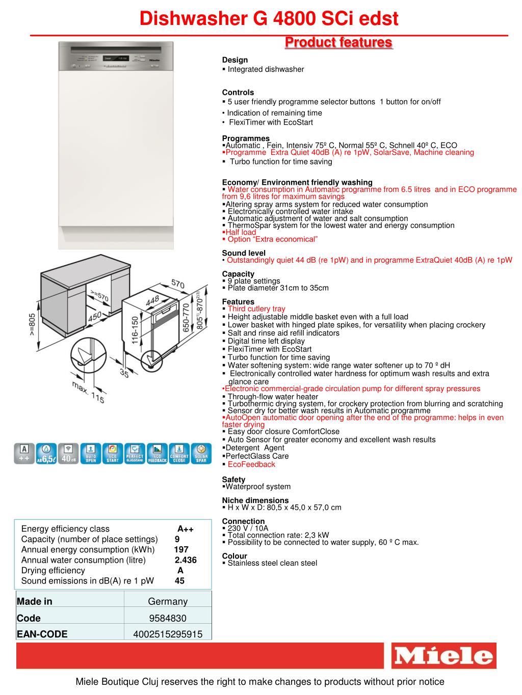 Dishwasher G 4800 SCi edst Product features Design • Integrated dishwasher Controls • 5 user friendly programme selector buttons 1 button for on/off • Indication of remaining time • FlexiTimer with EcoStart Programmes • Automatic , Fein, Intensiv 75º C, Normal 55º C, Schnell 40º C, ECO • Programme Extra Quiet 40dB (A) re 1pW, SolarSave, Machine cleaning • Turbo function for time saving Economy/ Environment friendly washing • Water consumption in Automatic programme from 6.5 litres and in ECO programme from 9,6 litres for maximum savings • Altering spray arms system for reduced water consumption • Electronically controlled water intake • Automatic adjustment of water and salt consumption • ThermoSpar system for the lowest water and energy consumption • Half load • Option “Extra economical” Sound level • Outstandingly quiet 44 dB (re 1pW) and in programme ExtraQuiet 40dB (A) re 1pW Capacity • 9 plate settings • Plate diameter 31cm to 35cm Features • Third cutlery tray • Height adjustable middle basket even with a full load • Lower basket with hinged plate spikes, for versatility when placing crockery • Salt and rinse aid refill indicators • Digital time left display • FlexiTimer with EcoStart • Turbo function for time saving • Water softening system: wide range water softener up to 70 º dH • Electronically controlled water hardness for optimum wash results and extra glance care • Electronic commercial-grade circulation pump for different spray pressures • Through-flow water heater • Turbothermic drying system, for crockery protection from blurring and scratching • Sensor dry for better wash results in Automatic programme • AutoOpen automatic door opening after the end of the programme: helps in even faster drying • Easy door closure ComfortClose • Auto Sensor for greater economy and excellent wash results • Detergent Agent • PerfectGlass Care • EcoFeedback Safety • Waterproof system Niche dimensions • H x W x D: 80,5 x 45,0 x 57,0 cm Connection • 230 V / 10A • Total connection rate: 2,3 kW • Possibility to be connected to water supply, 60 º C max. Colour • Stainless steel clean steel Energy efficiency class A++Capacity (number of place settings)9Annual energy consumption (kWh)197 Annual water consumption (litre)2.436 Drying efficiency ASound emissions in dB(A) re 1 pW 45 Miele Boutique Cluj reserves the right to make changes to products without prior notice