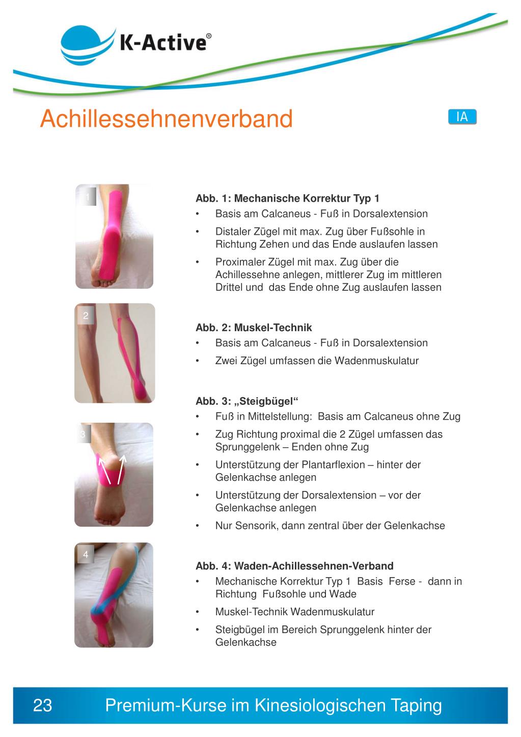 Achillessehnenverband 1 • Abb. 1: Mechanische Korrektur Typ 1 • Basis am Calcaneus - Fuß in Dorsalextension • Distaler Zügel mit max. Zug über Fußsohle in Richtung Zehen und das Ende auslaufen lassen • Proximaler Zügel mit max. Zug über die Achillessehne anlegen, mittlerer Zug im mittleren Drittel und das Ende ohne Zug auslaufen lassen • Abb. 2: Muskel-Technik • Basis am Calcaneus - Fuß in Dorsalextension • Zwei Zügel umfassen die Wadenmuskulatur • Abb. 3: „Steigbügel“ • Fuß in Mittelstellung: Basis am Calcaneus ohne Zug • Zug Richtung proximal die 2 Zügel umfassen das Sprunggelenk – Enden ohne Zug • Unterstützung der Plantarflexion – hinter der Gelenkachse anlegen • Unterstützung der Dorsalextension – vor der Gelenkachse anlegen • Nur Sensorik, dann zentral über der Gelenkachse • Abb. 4: Waden-Achillessehnen-Verband • Mechanische Korrektur Typ 1 Basis Ferse - dann in Richtung Fußsohle und Wade • Muskel-Technik Wadenmuskulatur • Steigbügel im Bereich Sprunggelenk hinter der Gelenkachse 2 3 4 23