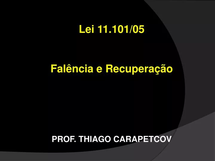 Lei 11.101/05 Falência e Recuperação. PROF. THIAGO CARAPETCOV. Introdução. Origem Ordenações do reino – “quebra de banca” Código Comercial 1850 – “das quebras” Código Criminal 1830 – “bancarrota” Conceito Falência Recuperação Objetivo. Introdução. Visão unitária x dualista