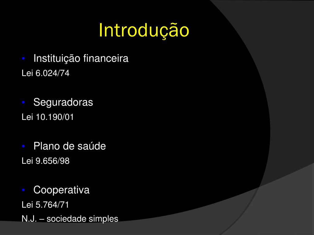 Introdução • Instituição financeira Lei 6.024/74 • Seguradoras Lei 10.190/01 • Plano de saúde Lei 9.656/98 • Cooperativa Lei 5.764/71 N.J. – sociedade simples