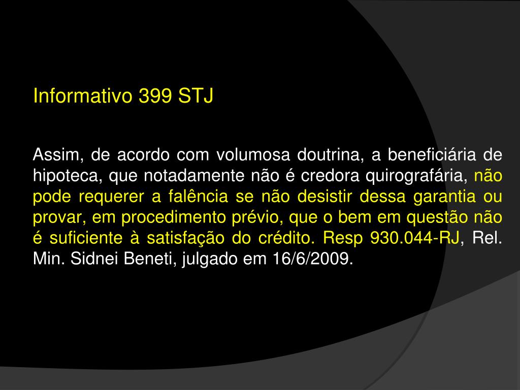Informativo 399 STJ Assim, de acordo com volumosa doutrina, a beneficiária de hipoteca, que notadamente não é credora quirografária, não pode requerer a falência se não desistir dessa garantia ou provar, em procedimento prévio, que o bem em questão não é suficiente à satisfação do crédito. Resp 930.044-RJ, Rel. Min. Sidnei Beneti, julgado em 16/6/2009.