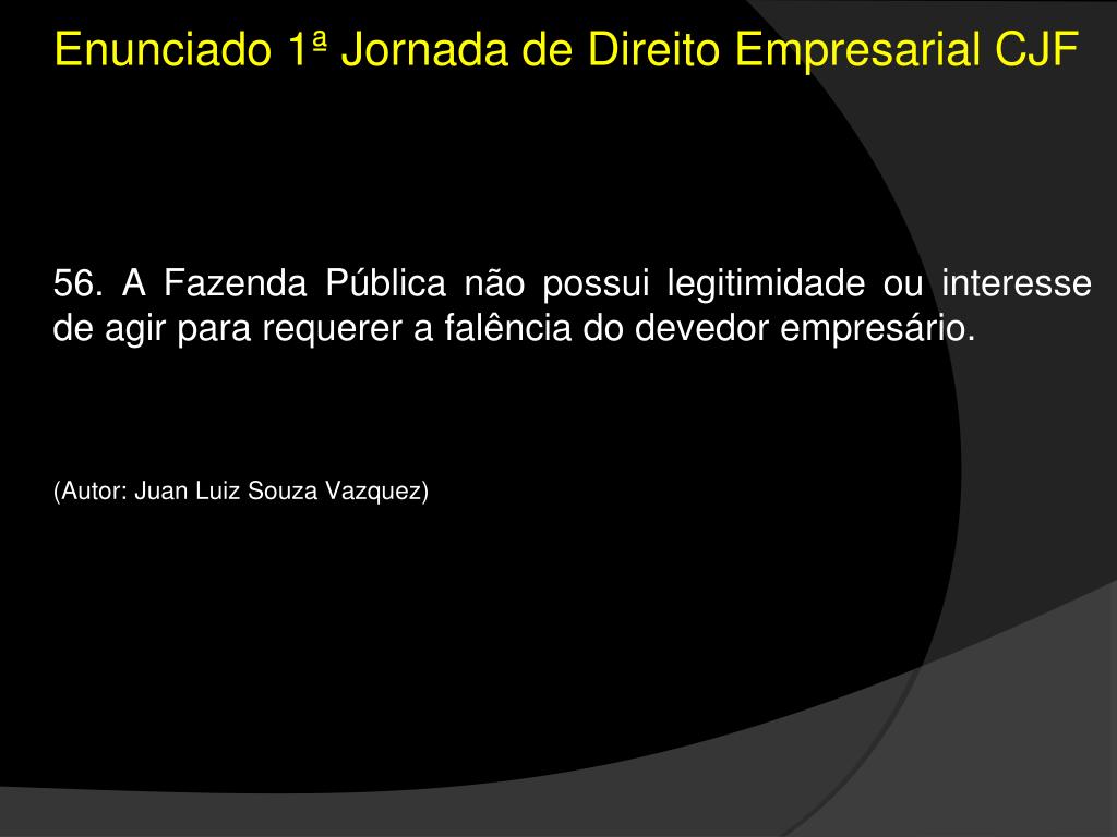 Enunciado 1ª Jornada de Direito Empresarial CJF • 56. A Fazenda Pública não possui legitimidade ou interesse de agir para requerer a falência do devedor empresário. • (Autor: Juan Luiz Souza Vazquez)