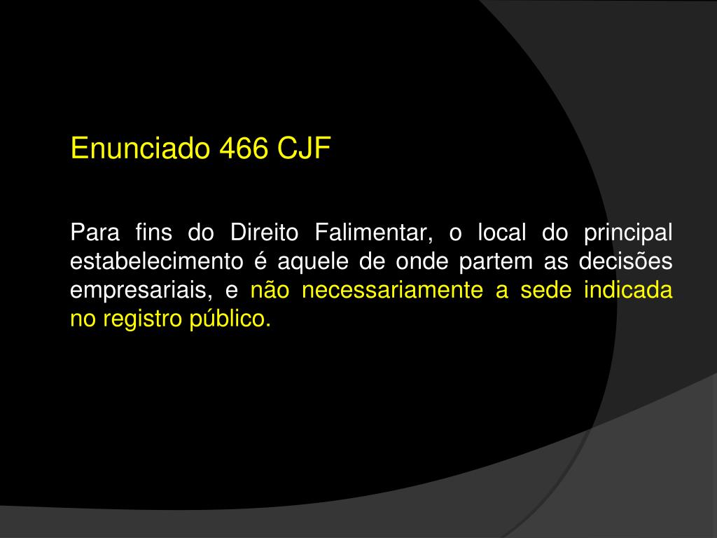 Enunciado 466 CJF • Para fins do Direito Falimentar, o local do principal estabelecimento é aquele de onde partem as decisões empresariais, e não necessariamente a sede indicada no registro público.