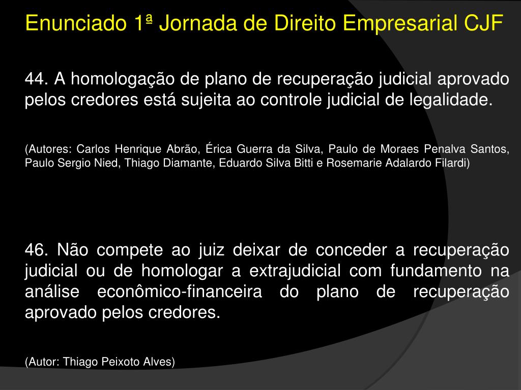 Enunciado 1ª Jornada de Direito Empresarial CJF • 44. A homologação de plano de recuperação judicial aprovado pelos credores está sujeita ao controle judicial de legalidade. • (Autores: Carlos Henrique Abrão, Érica Guerra da Silva, Paulo de Moraes Penalva Santos, Paulo Sergio Nied, Thiago Diamante, Eduardo Silva Bitti e RosemarieAdalardoFilardi) • 46. Não compete ao juiz deixar de conceder a recuperação judicial ou de homologar a extrajudicial com fundamento na análise econômico-financeira do plano de recuperação aprovado pelos credores. • (Autor: Thiago Peixoto Alves)