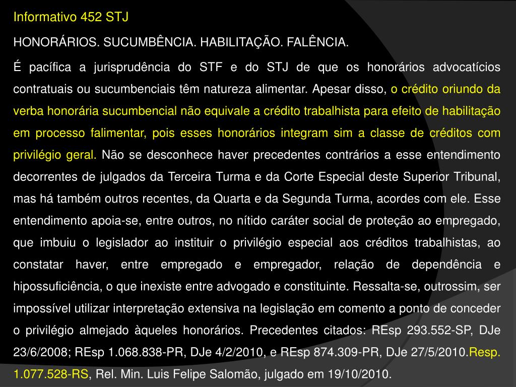 Informativo 452 STJ HONORÁRIOS. SUCUMBÊNCIA. HABILITAÇÃO. FALÊNCIA. É pacífica a jurisprudência do STF e do STJ de que os honorários advocatícios contratuais ou sucumbenciais têm natureza alimentar. Apesar disso, o crédito oriundo da verba honorária sucumbencial não equivale a crédito trabalhista para efeito de habilitação em processo falimentar, pois esses honorários integram sim a classe de créditos com privilégio geral. Não se desconhece haver precedentes contrários a esse entendimento decorrentes de julgados da Terceira Turma e da Corte Especial deste Superior Tribunal, mas há também outros recentes, da Quarta e da Segunda Turma, acordes com ele. Esse entendimento apoia-se, entre outros, no nítido caráter social de proteção ao empregado, que imbuiu o legislador ao instituir o privilégio especial aos créditos trabalhistas, ao constatar haver, entre empregado e empregador, relação de dependência e hipossuficiência, o que inexiste entre advogado e constituinte. Ressalta-se, outrossim, ser impossível utilizar interpretação extensiva na legislação em comento a ponto de conceder o privilégio almejado àqueles honorários. Precedentes citados: REsp 293.552-SP, DJe 23/6/2008; REsp 1.068.838-PR, DJe 4/2/2010, e REsp 874.309-PR, DJe 27/5/2010.Resp. 1.077.528-RS, Rel. Min. Luis Felipe Salomão, julgado em 19/10/2010.