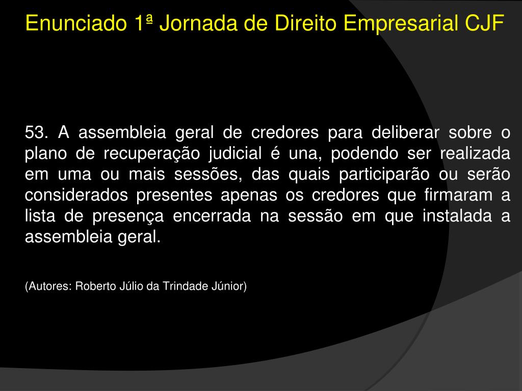 Enunciado 1ª Jornada de Direito Empresarial CJF • 53. A assembleia geral de credores para deliberar sobre o plano de recuperação judicial é una, podendo ser realizada em uma ou mais sessões, das quais participarão ou serão considerados presentes apenas os credores que firmaram a lista de presença encerrada na sessão em que instalada a assembleia geral. • (Autores: Roberto Júlio da Trindade Júnior)