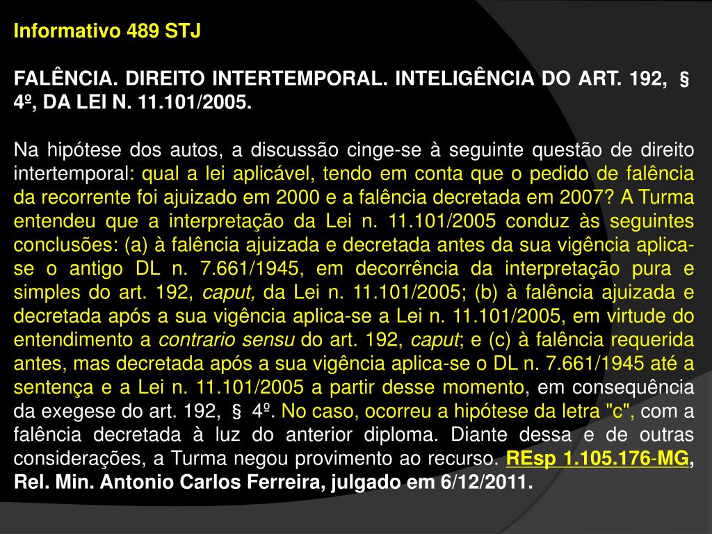 Informativo 489 STJ FALÊNCIA. DIREITO INTERTEMPORAL. INTELIGÊNCIA DO ART. 192, § 4º, DA LEI N. 11.101/2005. Na hipótese dos autos, a discussão cinge-se à seguinte questão de direito intertemporal: qual a lei aplicável, tendo em conta que o pedido de falência da recorrente foi ajuizado em 2000 e a falência decretada em 2007? A Turma entendeu que a interpretação da Lei n. 11.101/2005 conduz às seguintes conclusões: (a) à falência ajuizada e decretada antes da sua vigência aplica-se o antigo DL n. 7.661/1945, em decorrência da interpretação pura e simples do art. 192, caput, da Lei n. 11.101/2005; (b) à falência ajuizada e decretada após a sua vigência aplica-se a Lei n. 11.101/2005, em virtude do entendimento a contrario sensu do art. 192, caput; e (c) à falência requerida antes, mas decretada após a sua vigência aplica-se o DL n. 7.661/1945 até a sentença e a Lei n. 11.101/2005 a partir desse momento, em consequência da exegese do art. 192, § 4º. No caso, ocorreu a hipótese da letra "c", com a falência decretada à luz do anterior diploma. Diante dessa e de outras considerações, a Turma negou provimento ao recurso. REsp 1.105.176-MG, Rel. Min. Antonio Carlos Ferreira, julgado em 6/12/2011.