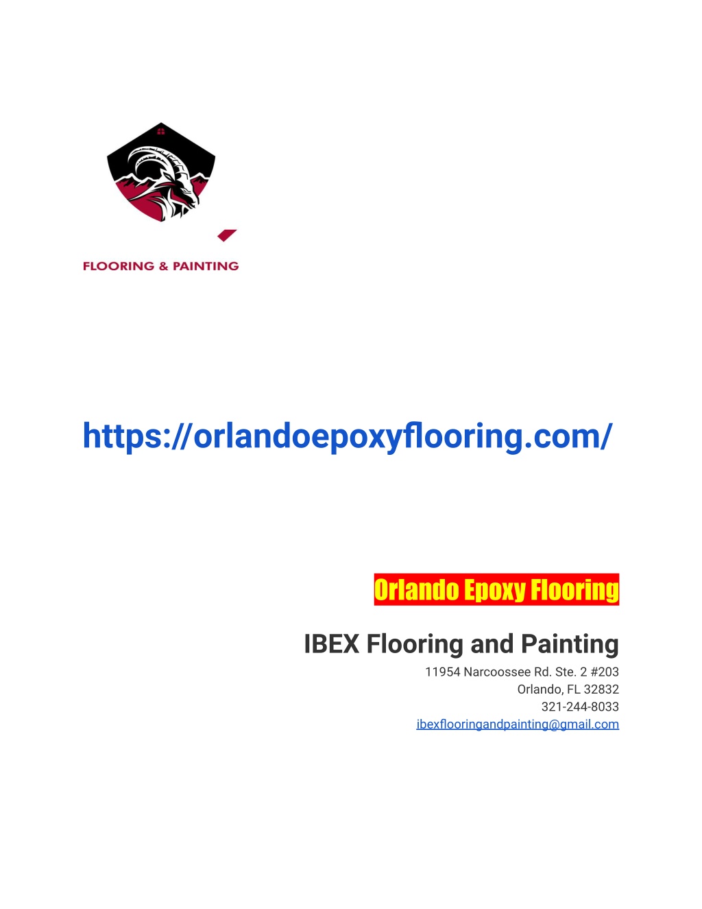https://orlandoepoxyflooring.com/ OrlandoEpoxyFlooring IBEX Flooring and Painting 11954 Narcoossee Rd. Ste. 2 #203 Orlando, FL 32832 321-244-8033 ibexflooringandpainting@gmail.com