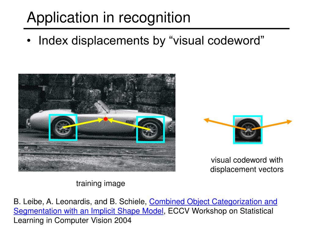 Application in recognition • Index displacements by “visual codeword” test image B. Leibe, A. Leonardis, and B. Schiele, Combined Object Categorization and Segmentation with an Implicit Shape Model, ECCV Workshop on Statistical Learning in Computer Vision 2004
