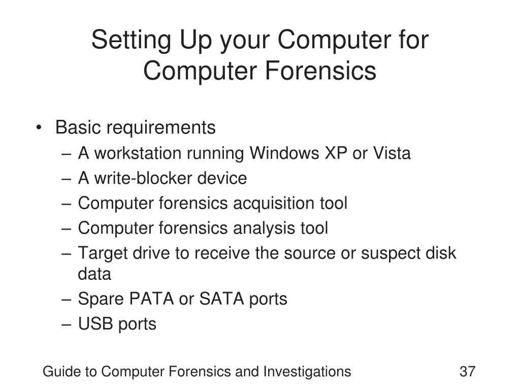 Setting Up your Computer for Computer Forensics • Basic requirements • A workstation running Windows XP or Vista • A write-blocker device • Computer forensics acquisition tool • Computer forensics analysis tool • Target drive to receive the source or suspect disk data • Spare PATA or SATA ports • USB ports Guide to Computer Forensics and Investigations