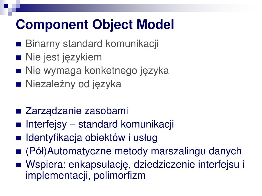 Component Object Model • Binarny standard komunikacji • Nie jest językiem • Niewymagakonketnegojęzyka • Niezależnyodjęzyka • Zarządzaniezasobami • Interfejsy – standard komunikacji • Identyfikacjaobiektówiusług • (Pół)Automatycznemetodymarszalingudanych • Wspiera: enkapsulację, dziedziczenieinterfejsuiimplementacji, polimorfizm