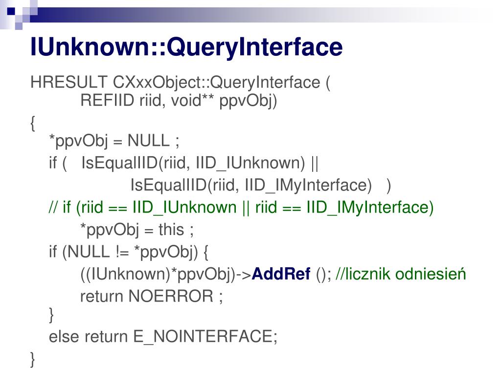 IUnknown::QueryInterface HRESULT CXxxObject::QueryInterface ( REFIID riid, void** ppvObj) {*ppvObj = NULL ; if ( IsEqualIID(riid, IID_IUnknown) || IsEqualIID(riid, IID_IMyInterface) ) // if (riid == IID_IUnknown || riid == IID_IMyInterface) *ppvObj = this ; if (NULL != *ppvObj) { ((IUnknown)*ppvObj)->AddRef(); //licznikodniesień return NOERROR ;} else return E_NOINTERFACE; }
