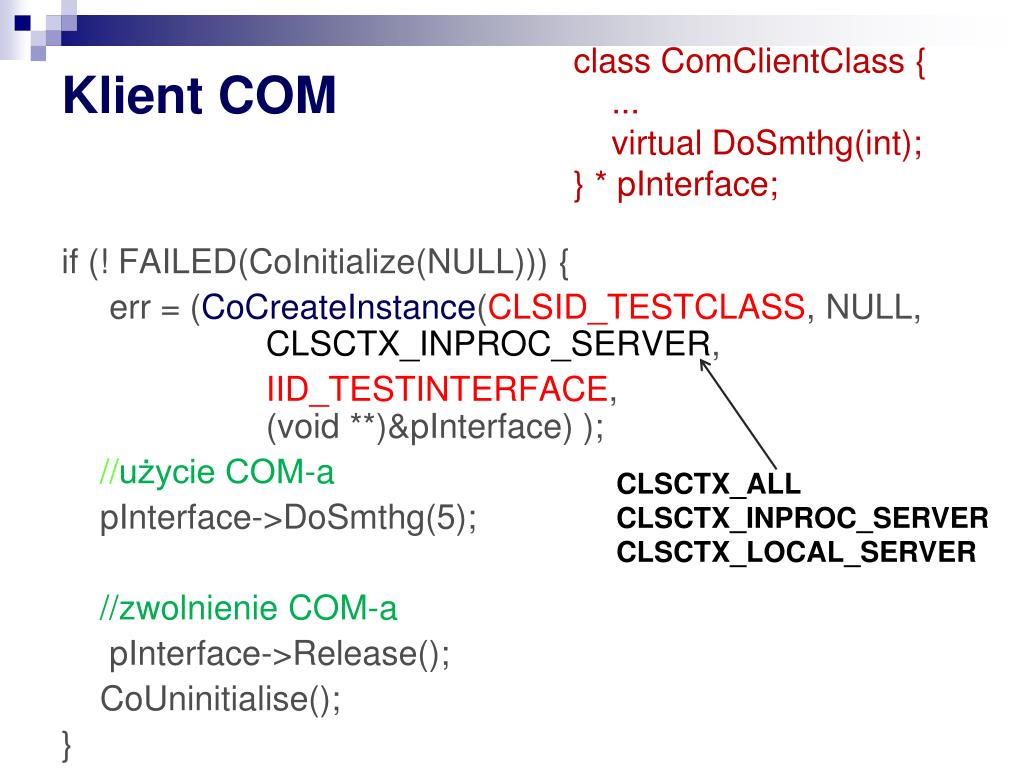 class ComClientClass { ... virtual DoSmthg(int); } * pInterface; Klient COM if (! FAILED(CoInitialize(NULL))) { err = (CoCreateInstance(CLSID_TESTCLASS, NULL,CLSCTX_INPROC_SERVER, IID_TESTINTERFACE, (void **)&pInterface) ); //użycie COM-a pInterface->DoSmthg(5); //zwolnienie COM-a pInterface->Release(); CoUninitialise(); } CLSCTX_ALL CLSCTX_INPROC_SERVER CLSCTX_LOCAL_SERVER