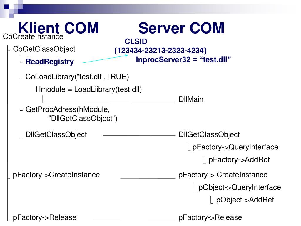 Klient COM Server COM CoCreateInstance CLSID {123434-23213-2323-4234} InprocServer32 = “test.dll” CoGetClassObject ReadRegistry CoLoadLibrary(“test.dll”,TRUE) Hmodule = LoadLiibrary(test.dll) DllMain GetProcAdress(hModule, ”DllGetClassObject”) DllGetClassObject DllGetClassObject pFactory->QueryInterface pFactory->AddRef pFactory->CreateInstance pFactory-> CreateInstance pObject->QueryInterface pObject->AddRef pFactory->Release pFactory->Release